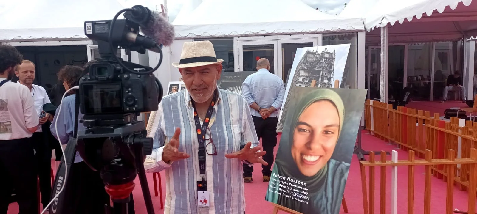 Turns out that instead of the Majestic, the event was held somewhere else. I heard from those close on the ground that it ended up being in the Palestinian Pavilion as there had been a lot of “aggressive messages” surrounding it, according to the organizers. Farsi then reached out to the managers of the Pavilion, to ensure everyone’s safety and the event was held there, not at the Majestic. See a shot below featuring the late Hassona’s portrait and Rashid Masharawi speaking to the press. Masharawi was the force behind the 2024 doc From Ground Zero.